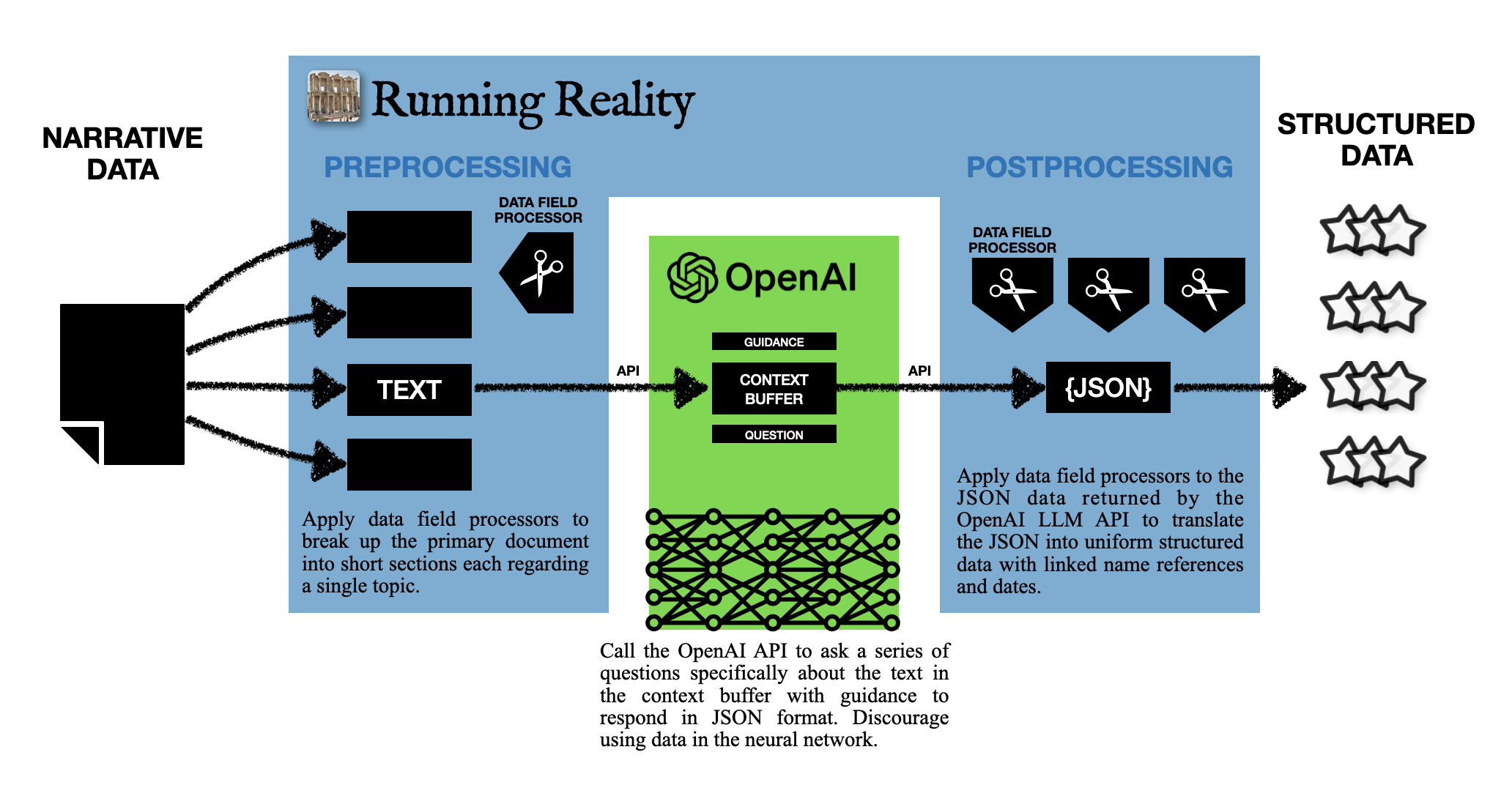 Running Reality adapted its existing data source processor that can ingest, transform, and reformat structured historical data. The Running Reality app calls the LLM-as-a-service known as OpenAI GPT via its Application Programming Interface (API). The app sends blocks of narrative wrapped with guidance instructions 1) to only use the text provided and 2) to produce JavaScript Object Notation (JSON) output and a series of questions about whether the text references historical events, such as whether a city experienced an earthquake. This capability is experimental, but is currently available to all users of the app. Running Reality is characterizing the performance of this experimental approach by assessing against narrative data sources of value to Running Reality.