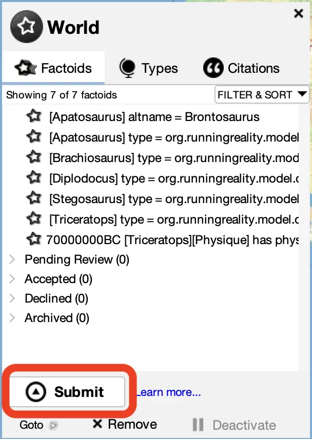The status of the factoids you have edited are tracked in the world sidebar panel. You open the panel by clicking on "See world data..." in the search box, then you will have three tabs. The first tab tracks the status of your edits and your submissions. Your working factoids are shown in the list, but submitted factoids have their status tracked in sub-lists. These are: