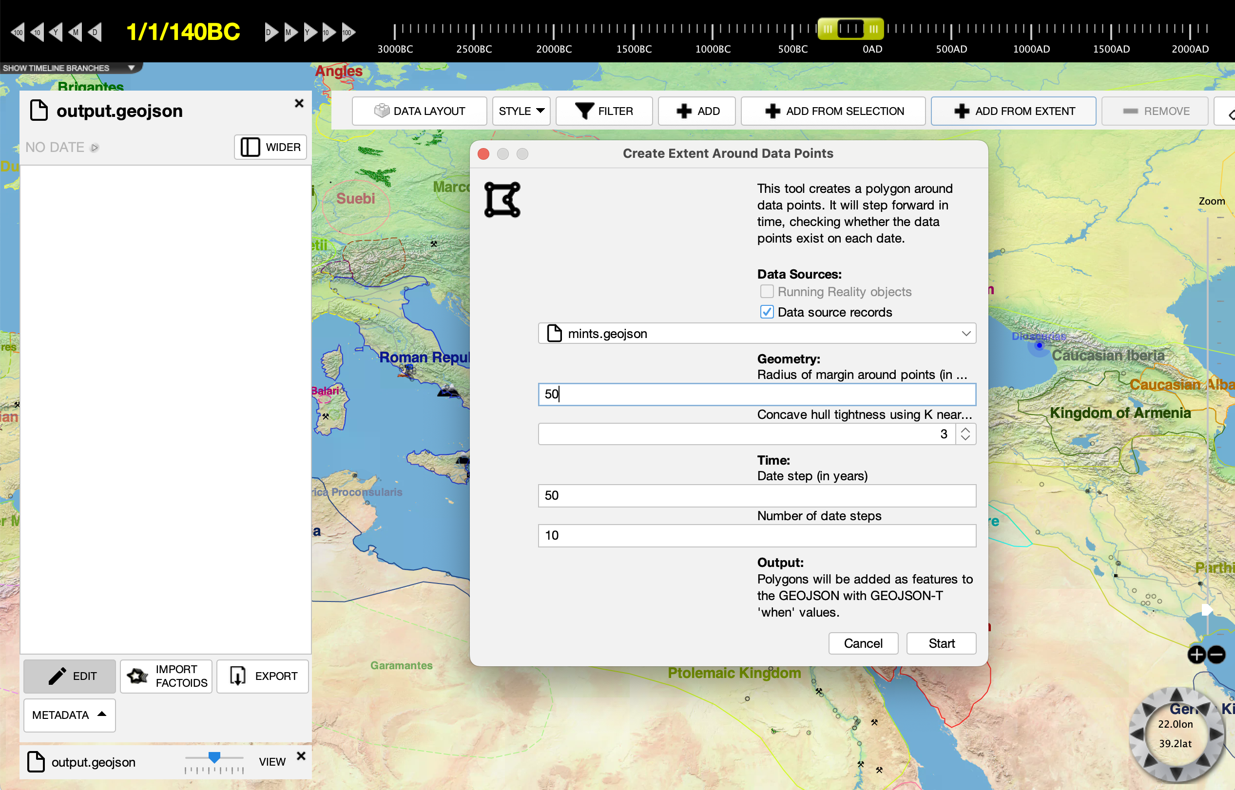 Now, we are going to use the filtered data as an input to a simple analysis. We are going to draw a polygon feature around the extent of the filtered data points. Since the filter selected above is all mints where the name begins with the letter D, we will create a polygon of the extent of such mints. A more sophisticated filter would produce a more useful research result than this simple tutorial.