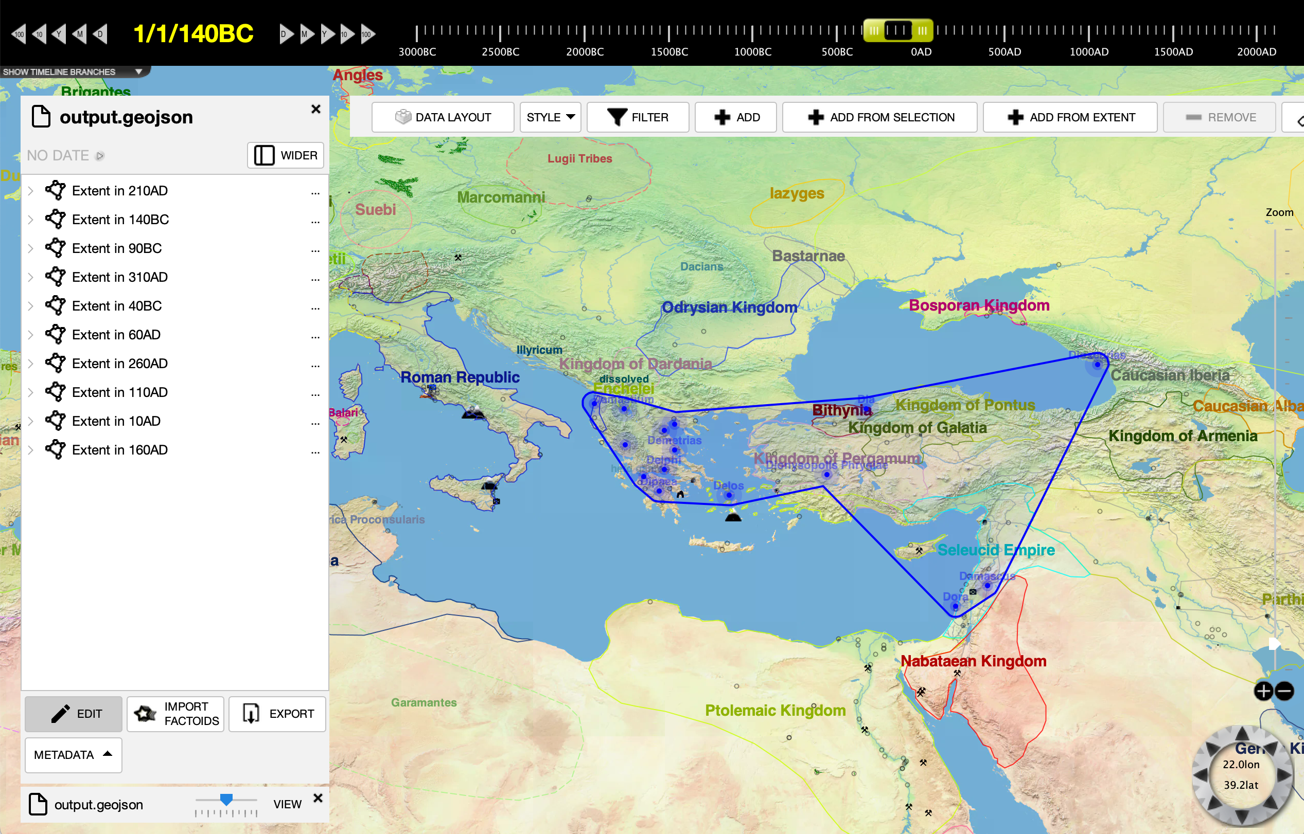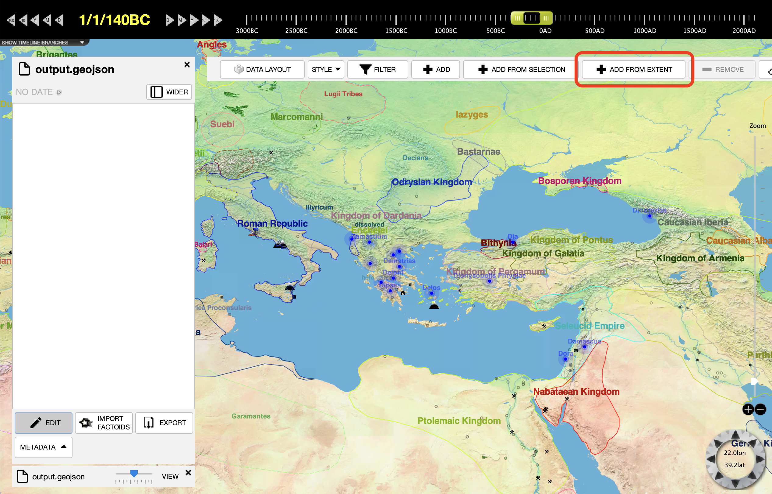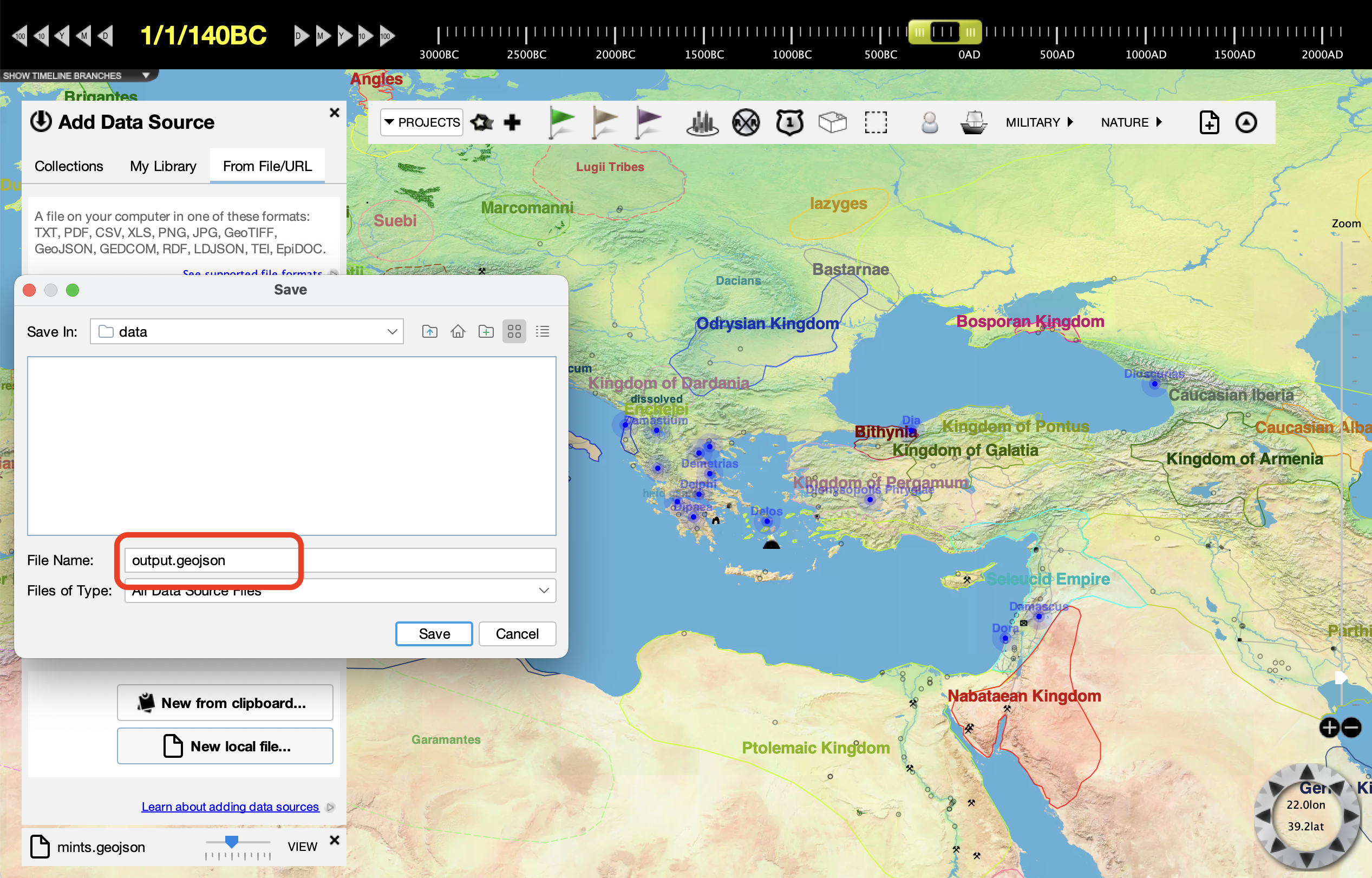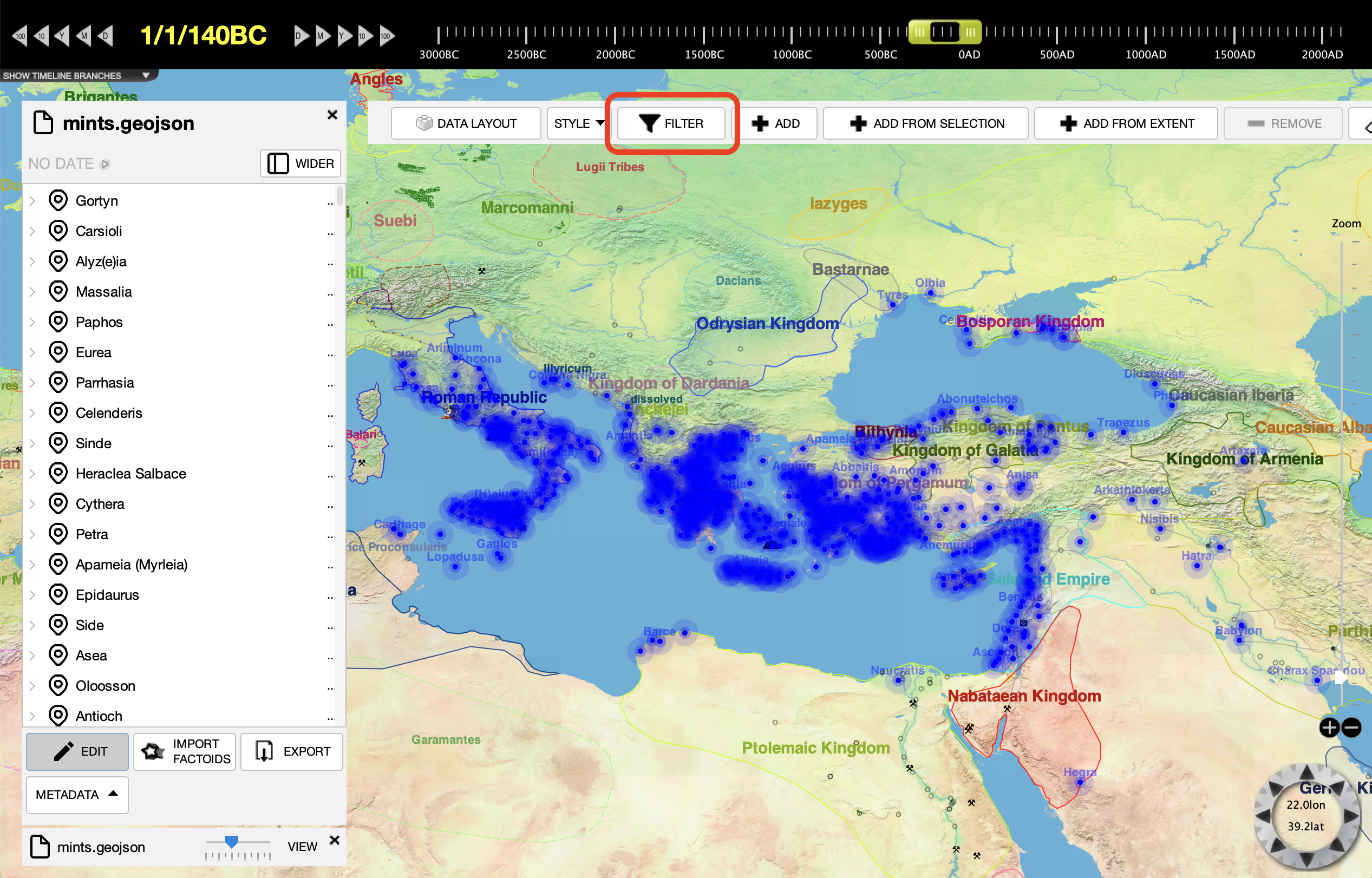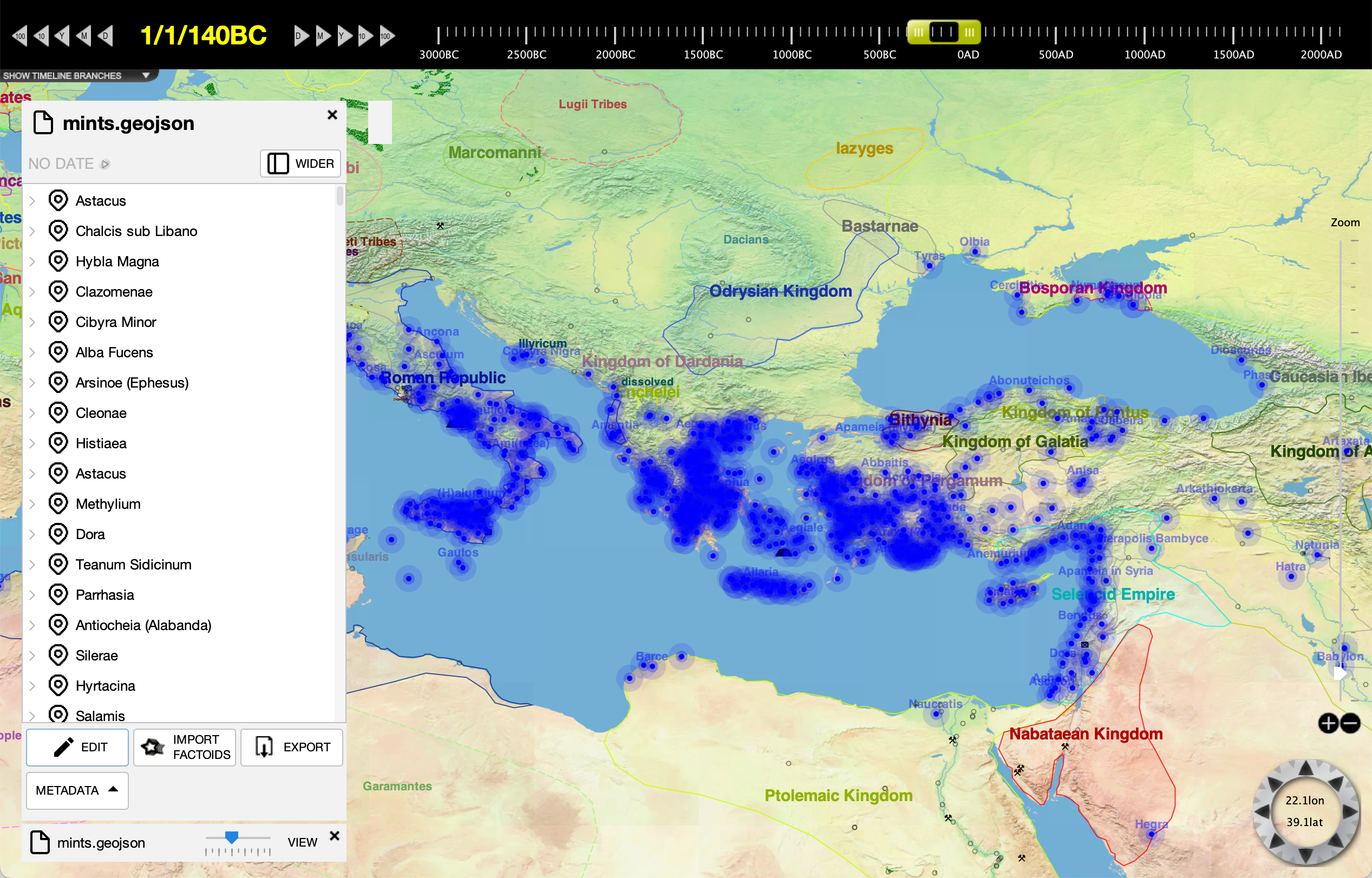 We are going to use a GeoJSON file from GreekCoinage.org that lists all coin mints in the classical Mediterranean world. We could have used a file of a different format as well, such as an RDF file. The file is here if you would like to download a copy yourself: