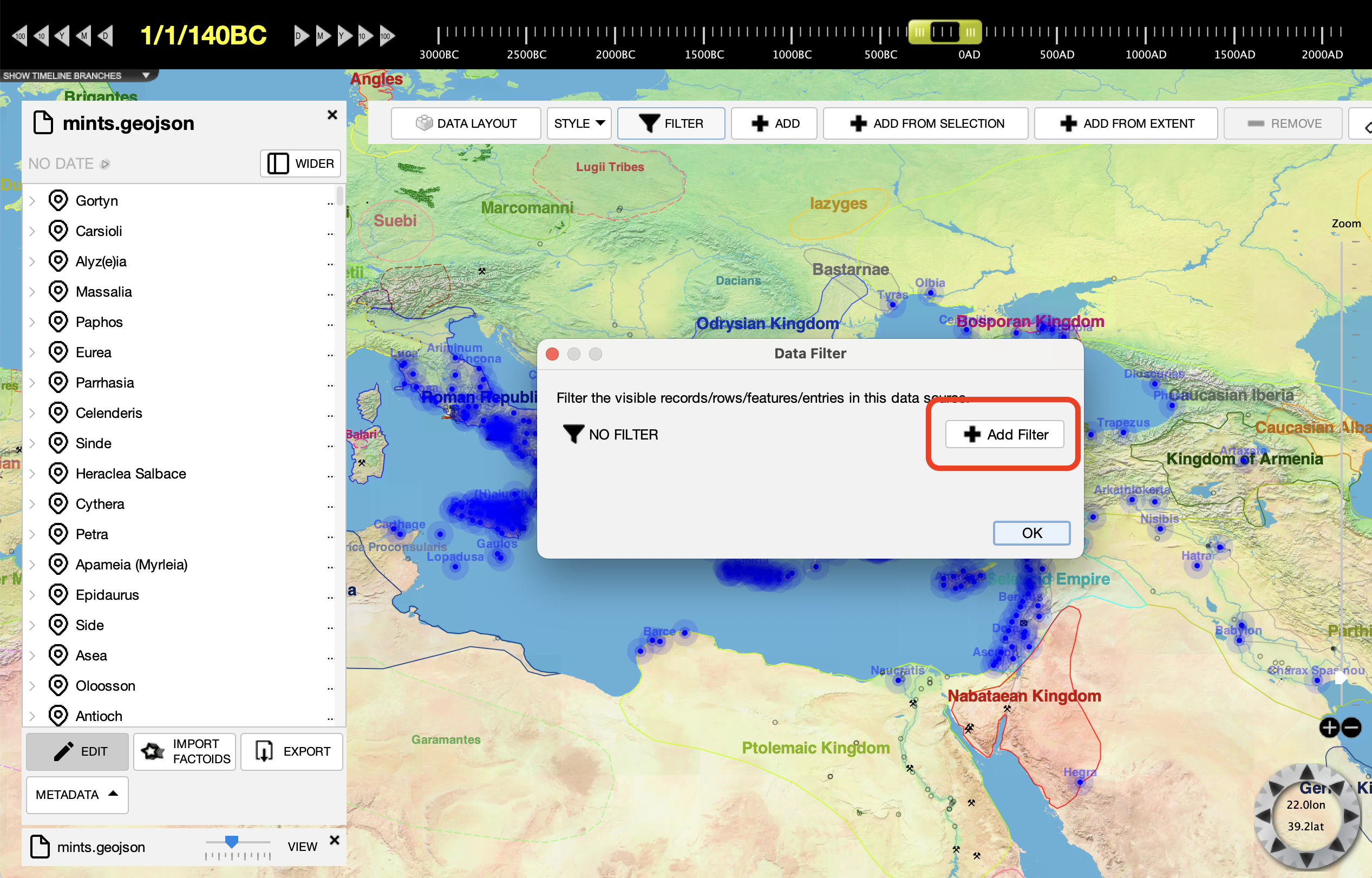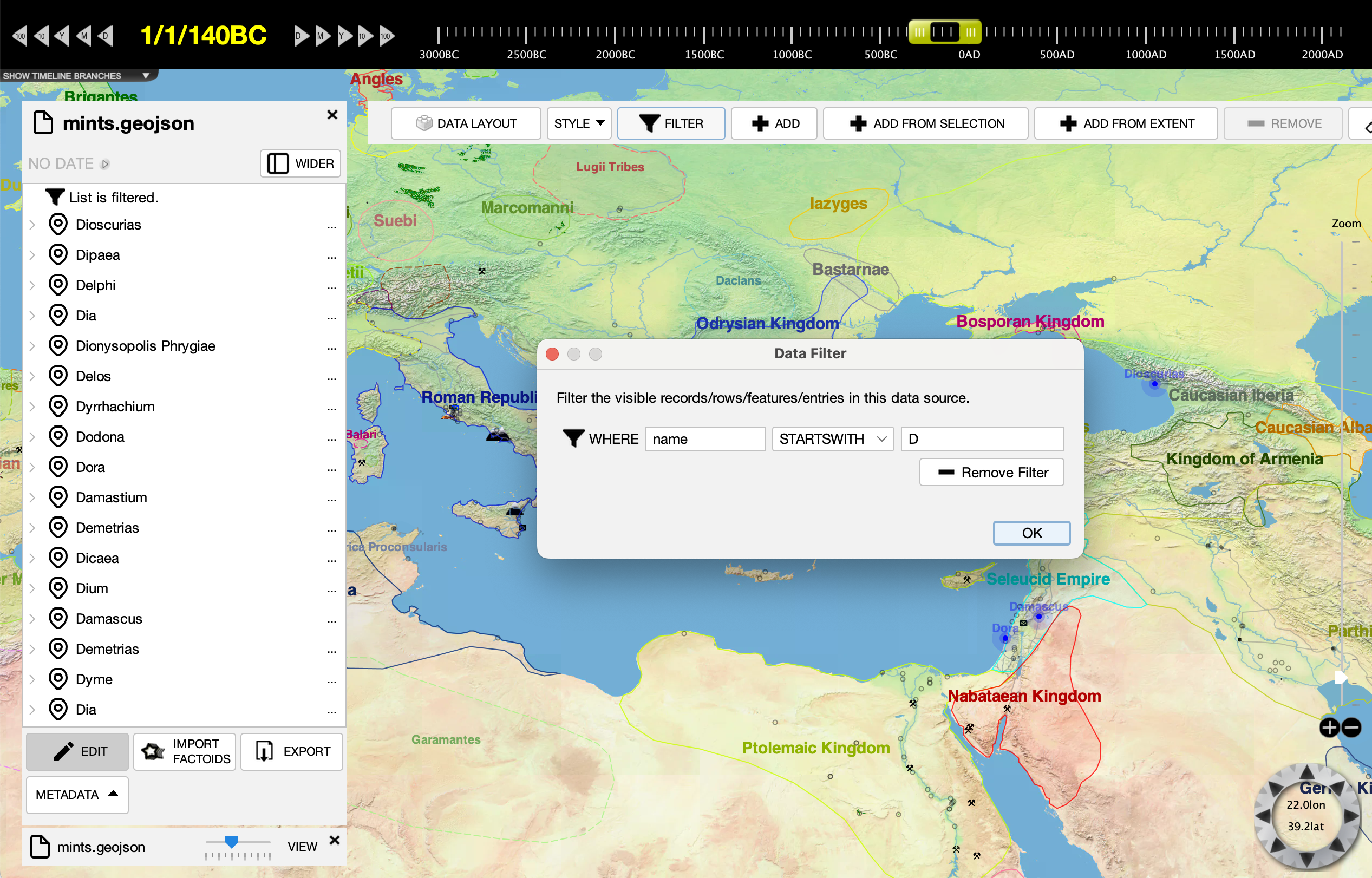 Change the filter terms from the defaults to the property "name", the criteria "STARTSWITH", and the value "D". This will filter the mints for only those where their name starts with the letter D. This is not a particularly useful filter, but it illustrates the technique. If your GeoJSON file or other file has more properties, then you can filter on those. I.e. if you have a description field you can identify all locations that have "silver coin" mentioned.